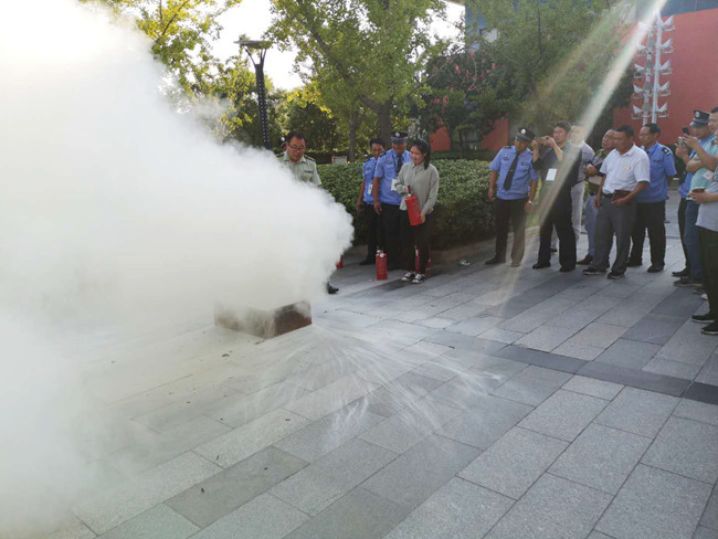 消防隊員現(xiàn)場講解滅火器使用原理,并組織物業(yè)人員、企業(yè)負責人現(xiàn)場操作。
