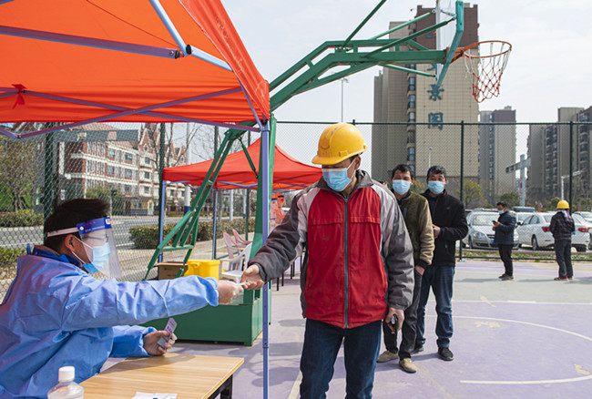 3月23日,蘇宿工業(yè)園區(qū)在一室外籃球場內(nèi)對全區(qū)在建工程施工人員進行核酸抽檢。