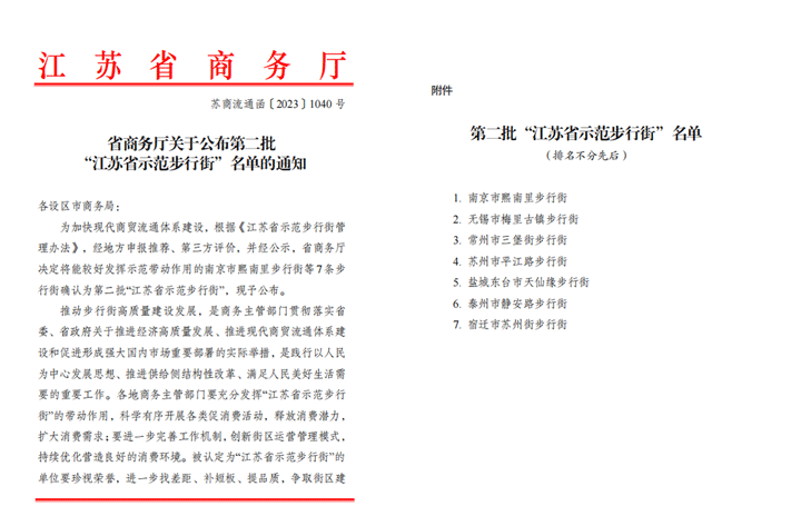 此次評定工作是根據(jù)《江蘇省示范步行街管理辦法》,由江蘇省商務(wù)廳集中組織第三方專家和評審員驗收,先后經(jīng)過上報資料、專家審核、實地考察、全省評比等方式確定7條江蘇省示范街區(qū)步行街。