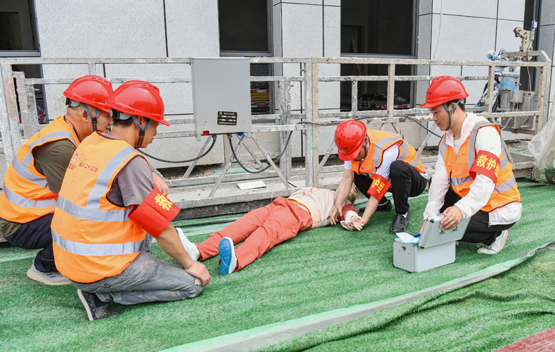 應急演練現(xiàn)場模擬了一名施工人員,在安裝外墻鋁板作業(yè)過程中,因違反安全技術(shù)交底要求擅自改變作業(yè)程序,不慎從高處墜落受傷。安全員發(fā)現(xiàn)該情況后,立即上報,隨即應急救援預案迅速啟動,各小組聯(lián)合行動,通過科學有序的救援,及時將傷者送醫(yī)救治,整個演練過程井然有序。通過演練提高了員工應急自救能力,減少高空墜落事故的發(fā)生,并在發(fā)生時能及時有效地進行自救和互救。